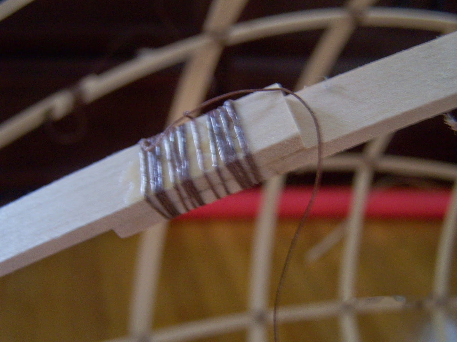 I used basket reed for the ribs, again gluing them and tying them with fishing line.