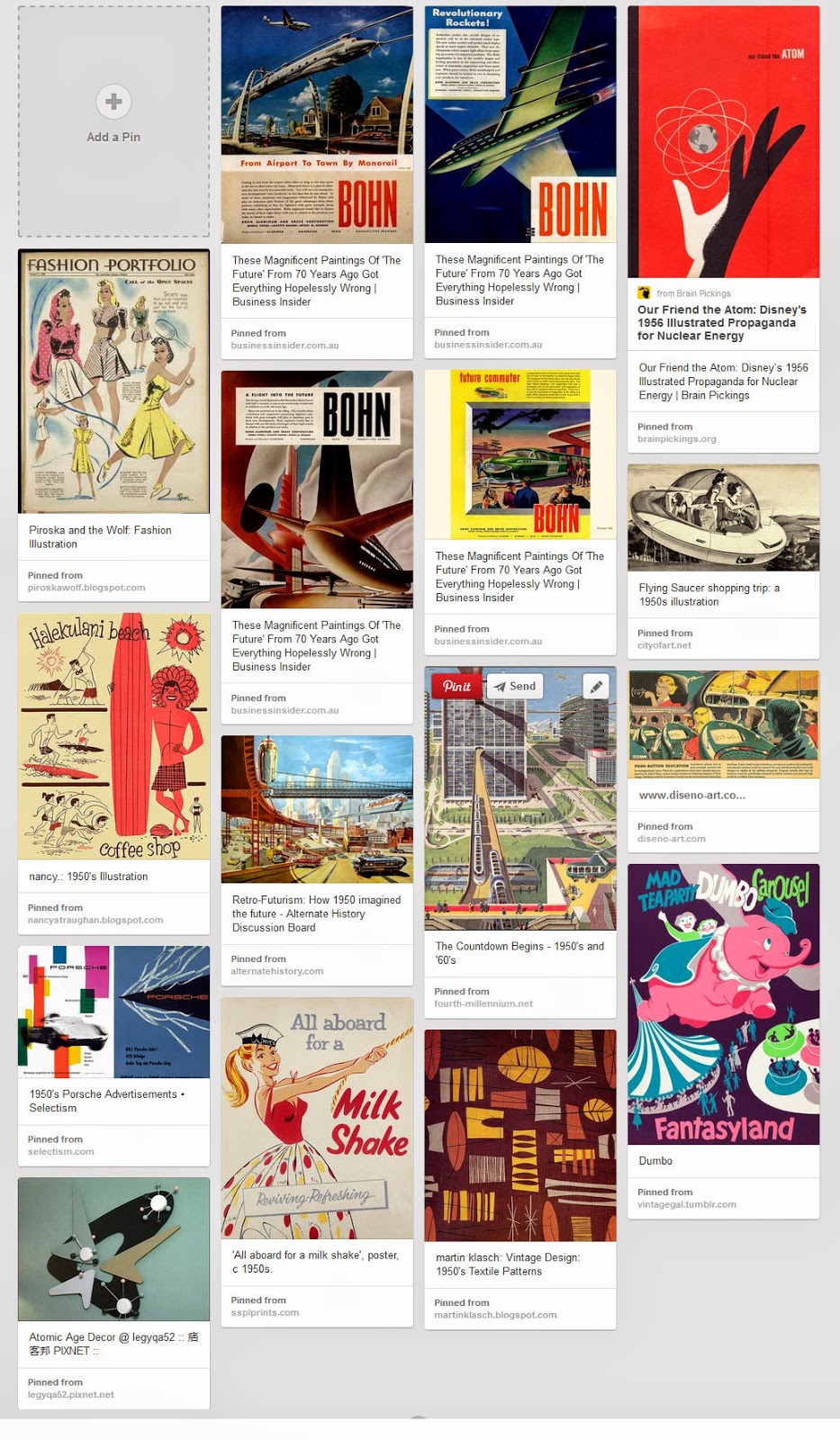 I started with a Pinterest board of ads and other design from the “Atomic age” – 1940’s to early 1960’s. (Yes, I finally found a use for Pinterest, as an easy place to keep design inspiration.)
