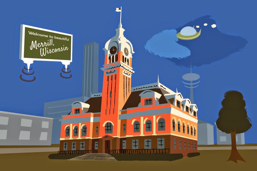 I really really liked the BOHN ads especially, so I decided to use a bit of three point perspective in my imaging of a retro-futuristic Merrill, but I went with one of Merrill’s most recognizable landmarks to anchor the card. If I decide to do a series I’d like to include the Cosmo, Chips, the old Merrill City Hall, the Lincoln House (oh sigh…), Council Grounds, T.B. Scott Library.  Still, here’s my first card, the Courthouse!  Not sure exactly what I’m going to do with the design, if I’m going to sell it through something like Zazzle or what, but I’m pretty happy with how the design came out.